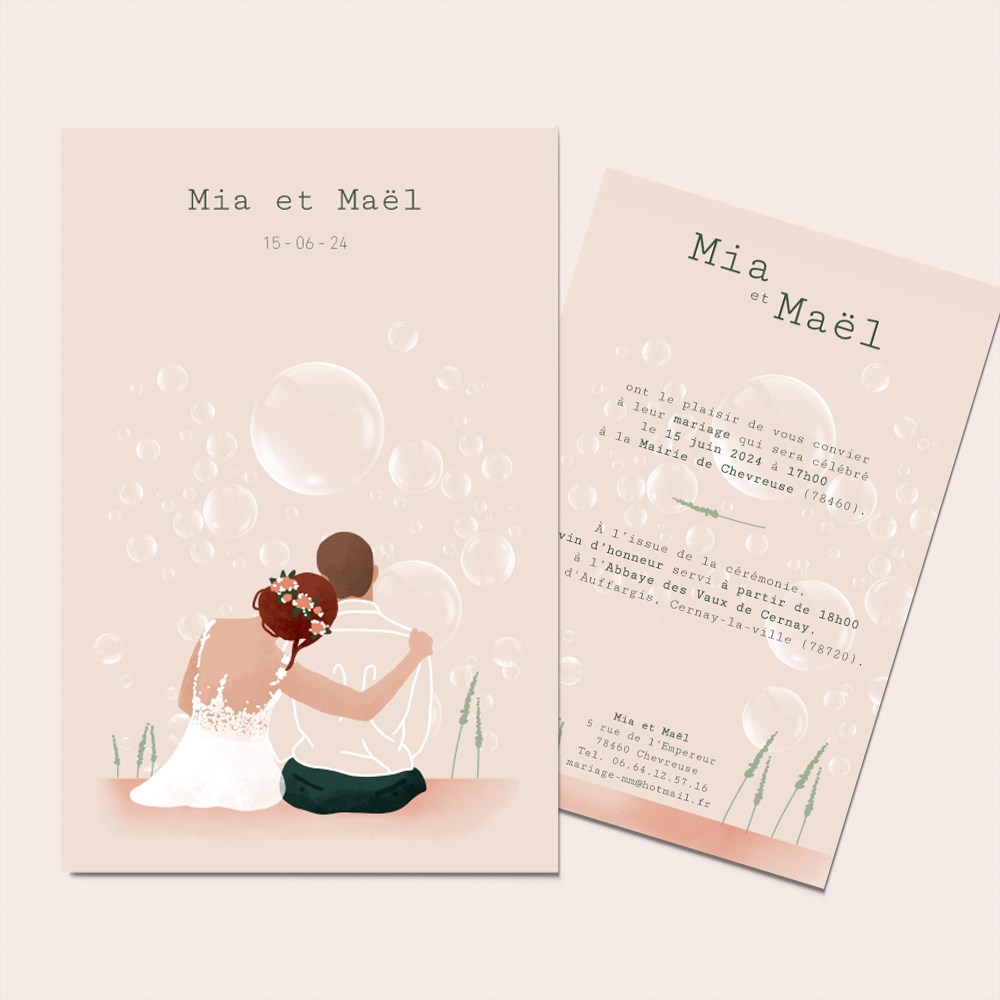 Romantisme, complicité et quiétude... Invitez vos proches et vos amis avec le faire-part de mariage « Bubbles » de la Collection « Illustration ». Ils seront séduits par son équilibre, tendresse et son illustration originale.