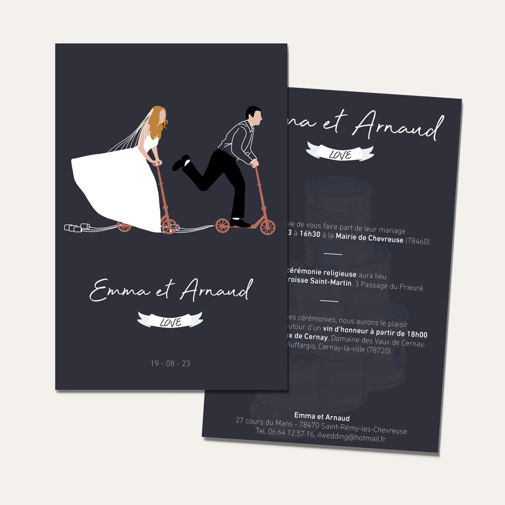 Amusement, tendance et romantisme... Invitez vos proches et vos amis avec le faire-part de mariage « Trottinette » de la Collection « Illustration ». Ils seront charmés par son originalité, légèreté et son graphisme original.