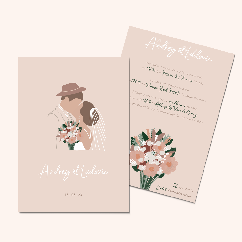 This model includes an announcement (recto / verso cardboard - 13.5 x 19 cm format). White envelope 14 x 20 cm offered.