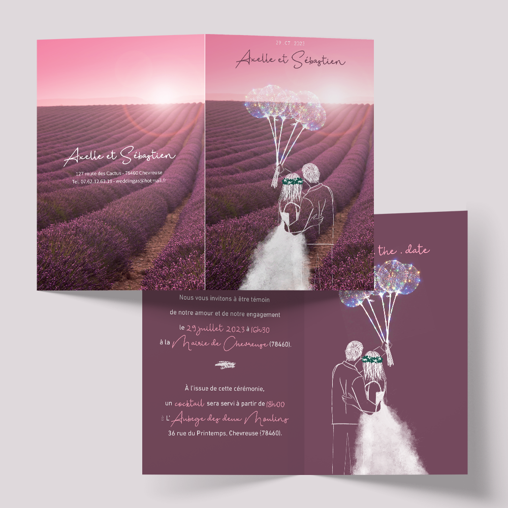 Complicity, strolling and sweetness ... Invite your loved ones and friends with the "Lavande" wedding invitation from the "Composition" Collection. They will be charmed by its originality and elegance. A totally exclusive, innovative and very trendy “photo / illustration” composition.