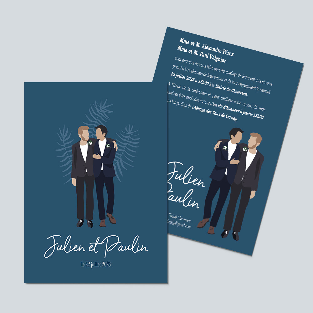 Complicity, tenderness and sensitivity ... Invite your relatives and friends with the wedding invitation "To be a man" from the "Illustration" Collection. They will be charmed by its softness, lightness and its delicate illustration.